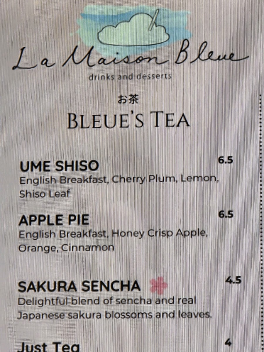 The menu at La Maison Bleue (LMB Cafe) offers a variety of specialty drinks primarily focused on tea-based beverages and creative coffee options. The menu is organized into several distinct tea series and unique drink creations, catering to different tastes and preferences.